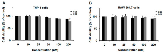 Effect of CC5 and CC8 on cell viability. (A) Effect on Human THP-1-derived macrophage viability. (B) Effect on RAW264.7 cell viability. Cells were seeded (5 × 103/well) and cultured in presence of CC5 (black bars) or CC8 (grey bars) at different concentrations (10–200 nM) of CC5 and CC8, for 24 h. Non-treated cells were used as negative control. Cell viability was evaluated using MTT assay. Data are representative of three independent experiments performed in triplicate, expressed as mean (±SD). p < 0.05 was considered statistically significant and is indicated with asterisks over the value (* p < 0.05).