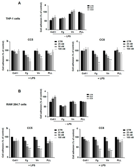 CC5 and CC8 reduce cell adhesion using cell adhesion assay. (A) Effect on THP-1-derived macrophage. (a) Cells were incubated without (black bars), or with 100 nM CC5 (dark grey bars), or with 100 nM CC8 (light grey bars) for 30 min. Cells were then allowed to attach on fibrinogen (Fg), Collagen I (Coll I), vitronectin (Vn), or poly-L-lysine (PLL). (b) Cells were stimulated with LPS (1 µg/mL) and seeded in wells coated with different extracellular matrices and incubated without or with various concentrations of CC5. (c) LPS-stimulated THP-1 cells were seeded in wells pretreated with different extracellular matrices and incubated without or with various concentrations of CC8. Non-treated cells were used as negative control. (B) Effect on RAW264.7 cells. (a) Cells were incubated without (black bars), or with 100 nM CC5 (dark grey bars), or with 100 nM CC8 (light grey bars) for 30 min. Cells were then allowed to attach on Fg, Coll I, Vn, or PLL. (b) Cells were stimulated with LPS (1 µg/mL), seeded in wells coated with different extracellular matrices and incubated without or with CC5 at various concentrations. (c) LPS-stimulated RAW264.7 cells were seeded in wells pretreated with different extracellular matrices and incubated without or with various concentrations of CC8. Non-treated cells were used as negative control. Data are representative of three independent experiments performed in triplicate, expressed as mean (±SD). p < 0.05 was considered statistically significant and is indicated with asterisks over the value (* p < 0.05, ** p < 0.01, *** p < 0.001).