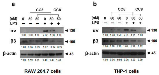 As shown in Figure 3, in Western blot assays using monoclonal antibodies against αv and β3 integrins, we found that CC5 and CC8 reduced the protein levels of the αvβ3 integrin subunits in both LPS-stimulated RAW264.7 and THP-1cells. This result supports the implication of αvβ3 integrin in the inhibitory effect of CC5 and CC8 on LPS-stimulated THP-1 and RAW264.7 cell adherence towards fibrinogen and vitronectin.