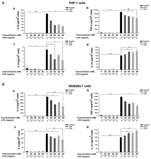 Cytokine release from macrophages is considered as an inflammatory response to stimulus. Interleukin (IL)-6, tumor necrosis factor (TNF), and IL-8 are well known pro-inflammatory cytokines which are involved in local and systemic inflammatory reactions, while IL-10, as an anti-inflammatory cytokine, is reported to block the production of the monokines (IL-1, IL-6, and TNF-α) in response to lipopolysaccharide or other stimuli [24]. Thus, THP-1 and RAW264.7 macrophages were firstly stimulated by LPS (1 μg/mL) to investigate whether CC5 and CC8 decreased the expression of inflammatory cytokines, such as IL-6, TNFα, IL-8, and IL-10 after 24 h. As shown in Figure 4A,B in black bars, the levels of inflammatory cytokines is significantly increased in LPS-stimulated THP-1 and RAW264.7 cells. In contrast, macrophage treatment with CC5 and CC8 (25 and 50 nM) reduced the release of IL-6, TNFα, and IL-8 cytokines (Figure 4A(a–c),B(a–c) and enhanced the production of IL-10 in a dose-dependent manner (Figure 4A(d),B(d)).