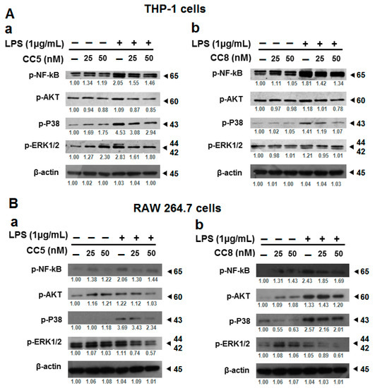 CC5 and CC8 modulate LPS-induced activation of NF-kB, ERK1/2, p38 MAPK, and Akt signaling pathways in LPS-stimulated THP-1 and RAW264.7 cells. (A) Cell lysates from human THP-1-derived macrophages untreated or treated with LPS (1 μg/mL) were analyzed by Western blot assay and performed to detect phosphorylated NF-kB, ERK1/2, p38 MAPK, and Akt in the presence or absence of different concentrations of CC5 (a) and CC8 (b). (B) Cell lysates from RAW264.7 untreated or treated with LPS (1 μg/mL) were analyzed by Western blot assay and performed to detect phosphorylated NF-κB, ERK1/2, p38 MAPK, and Akt in the presence or absence of different concentrations of CC5 (a) and CC8 (b). Protein band quantification was performed using the software program Image J. β-actin was used as a loading control. In LPS-stimulated cells, all data were statistically significant (p < 0.05) compared to control (untreated cells with proteins), except p-AKT in THP-1 cells with CC8 (at 25 nM), p-AKT, p-P38 in RAW264.7 cells with CC5 (at 25 nM) and p-AKT, pERK1/2 in RAW264.7 cells with CC8 (at 25 nM).