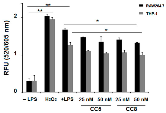 Intracellular ROS production decrease by CC5 and CC8 on LPS-stimulated THP-1 and RAW264.7 cells by measurement with intracellular ROS generation assay. RAW264.7 cells (black bars) and THP-1 cells (grey bars) were stimulated or not with LPS (1 µg/mL) and treated with different concentrations of CC5 and CC8. Untreated cells were used as negative control. H2O2 (1 mM) was used as positive control. Data are the mean of two independent experiments. p < 0.05 was considered statistically significant and is indicated with asterisks over the value (* p < 0.05, ** p < 0.01).