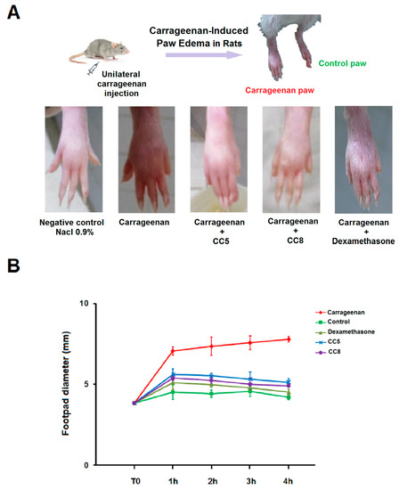 2.5. Effects of CC5 and CC8 on Carrageenan-Induced Paw Edema in Rats