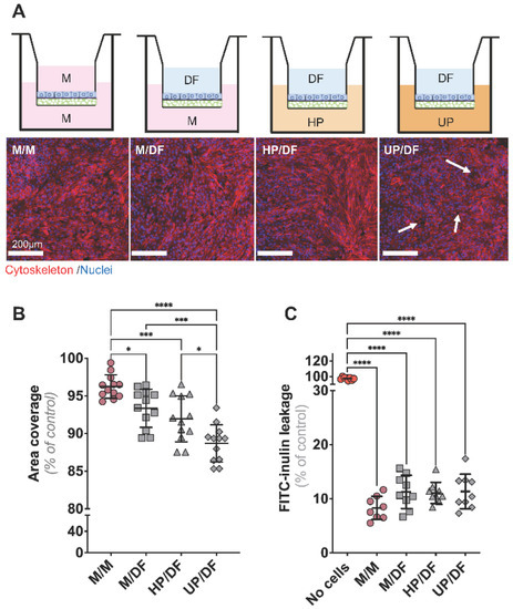 After initial proliferation at 33 °C for 3 days and 7 days of maturation at 37 °C, the apical compartment was loaded with 500 μL of DF, while the basal compartment was loaded with 1 mL of HP or UP and incubated for 240 min. Cultures with complete culture medium on both apical and basal sides were used as controls. Following the incubation period, the monolayer permeability was assessed by quantifying the diffusion of the fluorescein isothiocyanate-inulin (FITC-inulin, Sigma Aldrich, Zwijndrecht, The Netherlands) (0.1 mg/mL in Krebs-Henseleit (KH) buffer (Sigma Aldrich, Zwijndrecht, The Netherlands) supplemented with 10 mM HEPES (Acros Organics, Bridgewater, NJ, USA) from the basolateral to apical compartment for 30 min at 37 °C, under gentle shaking. Coated and noncoated membranes without cells were used as controls. Fluorescence was measured at an excitation wavelength of 490 nm and an emission wavelength of 520 nm, by means of a fluorescent plate microplate reader (Promega, Madison, WI, USA). Measured fluorescence values were used to calculate the inulin-FITC concentration in the apical compartment of all samples.
