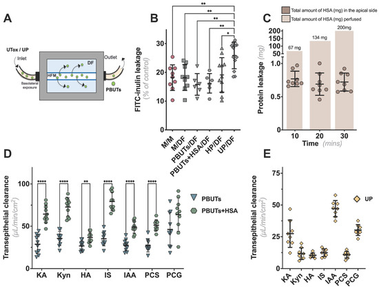 Evaluation of the monolayer integrity in HFM upon exposure to DF and UP. (A) Schematic representation of the BAK prototype. (B) Upon cell maturation, cells were perfused with either medium, PBUTs, PBUTs with HSA (PBUTs + HSA), HP, or UP for 30 min, followed by a 10 min perfusion with FITC-Inulin to evaluate monolayer integrity. (C) Quantification of total HSA leakage at the apical side. In brown blocks is the total amount of HSA (mg) perfused (6 mL/h) through the fibers at the corresponding time points. (D) Transepithelial clearance of PBUTs during the perfusion of the fibers with either PBUTs alone, with HSA 1 mM, or (E) UP. Data are shown as mean ± SD of four replicates from three independent experiments. * p < 0.01, ** p < 0.01, and **** p < 0.0001 using (A) a one-way ANOVA analysis followed by Tukey’s multiple comparison tests or (D) multiple Mann–Whitney tests. Abbreviations: M, medium; DF, dialysis fluid; HP, healthy plasma; UP, uremic plasma; KA, kynurenic acid; Kyn, kynurenine; HA, hippuric acid; IS, indoxyl sulfate; IAA, indole-3 acetic acid; PCS, p-cresyl sulfate; PCG, p-cresyl glucuronide.