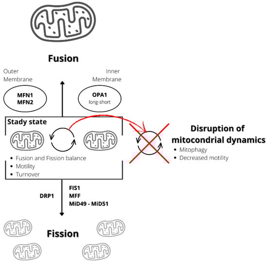 Mitochondrial dynamics regulate mitophagy and contribute to mitochondrial quality control. In mouse pancreatic β-cells, mitochondrial fission results in the identification of damaged mitochondria in the mitochondrial population and their subsequent removal by mitophagy [113]. Thus, defects in mitochondrial fusion or fission processes can cause defects in mitochondrial function and activity because mitochondrial dynamics involve multiple processes such as fission and fusion equilibrium, mitochondrial turnover, and motility. However, motility and turnover depend on fusion and fission [114]. Indeed, in neurons, defects in both fusion and fission lead to reduced mitochondrial motility and neuronal dysfunction [114]. In summary, mitochondrial dynamics impairment seems to be involved in several diseases [104].