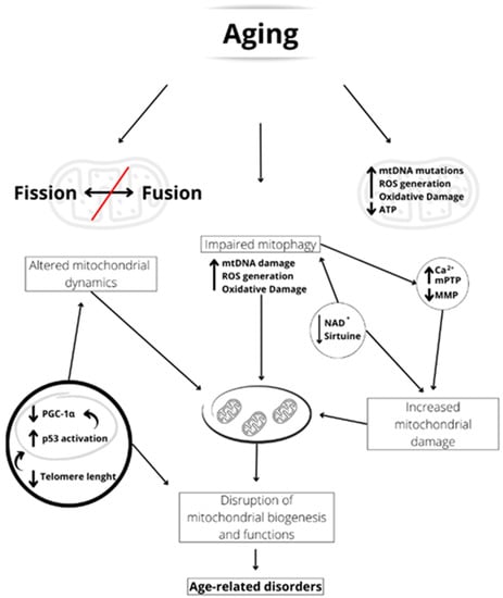 Schematic representation of the aging-linked mitochondrial dysfunctions. Aging can induce unbalanced fusion/fission dynamics, accumulation of mitochondrial damage, and impaired mitophagy. The shortened telomerase length activates p53, which reduces PGC-1α expression and, therefore, mitochondrial biogenesis. Furthermore, reduced NAD+ concentration and sirtuin activity led to impaired mitophagy. This may result in increased mitochondrial [Ca2+], mPTP formation, and inner mitochondrial membrane potential (MMP) reduction, leading to increased mitochondrial damage. All these factors induce an alteration of mitochondrial biogenesis and functionality, which are at the basis of age-related disorders.