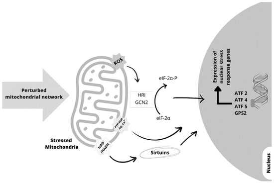 A more effective way to control mitochondrial quality is that damaged mitochondria can signal back to the nucleus to orchestrate a nuclear transcriptional response that aims to minimize mitochondrial stress and the resulting damage (retrograde signaling) (Figure 3) [166]. Retrograde signaling comprises evolutionary conserved mechanisms activated by several mitochondrial stresses, including misfolded mitochondrial proteins, increased mitochondrial ROS, altered NAD+/NADH and ATP/ADP ratios, calcium levels, and loss of membrane potential (Δψ) [168], that can induce multiple pathways that regulate the communication between mitochondria and nucleus. Each pathway culminates with the activation of many transcription factors, among which, in mammals, the stress-activated transcription factors 4, 5, and 2 (ATF4, ATF5, and ATF2) and G Protein Pathway Suppressor 2 (GPS2), that in the nucleus regulate the expression of nuclear stress response genes translating for mitochondrial chaperones and proteases, ROS detoxification enzymes, and mitochondrial import machinery [168,169] (Figure 3). One of the mitochondrial retrograde signaling pathways in mammals is the unfolded protein response (UPRmt), a coordinated response triggered by mtDNA depletion or by protein misfolding in the mitochondrial matrix [169]. The maintenance of the mitochondrial protein folding environment involves many mitochondrial molecular chaperones whose level of expression is dependent on the level of mitochondrial protein homeostasis through the mitochondria-to-nuclear signaling pathway UPRmt [170]. The transcription factor stress-activated transcription factor 1 (ATFS1) regulates UPRmt in C. elegans. ATFS1 possesses a sequence necessary for nuclear localization and an amino-terminal sequence that targets it to mitochondria and is essential for the repression of UPRmt. In basal conditions, ATFS1 passes into the mitochondria and is degraded. In conditions of mitochondrial stress and dysfunction, the mitochondrial import efficiency is reduced, and the amount of ATFS1 that accumulates in the cytosol and transfers to the nucleus increases [170]. In the nucleus, ATFS1 activates the expression of genes that induce the survival and recovery of the mitochondrial network [169]. In mammalian cells, ATF5 [171] and ATF4 [172] regulate UPRmt in a similar way to the response regulated by ATFS1 in C. elegans.