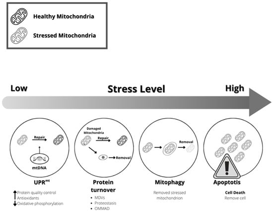 Therefore, cells can perceive the severity of mitochondrial dysfunction and define a response to a danger signal sent by this critical organelle. This response could be the elimination of the entire cell organelle or part of it, the activation of genes coding for proteases, antioxidant enzymes, and proteins involved in protein import into the mitochondria, mitochondrial dynamics, and cell metabolism [169] (Figure 4).