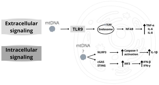 Alternatively, mtDNA can also be recognized by cyclic GMP-AMP synthase (cGAS), a cytosolic sensor of double-stranded DNA (dsDNA) [166]. Activation of cGAS by dsDNA activates a signaling pathway involving the adaptor protein STING, leading to the activation of the transcription factor IRF3. IRF3 induces the transcription of genes that also participate in viral infection, such as interferon β and γ (IFN-β, IFN-γ) [166]. The involvement of mtDNA in the activation of such a pathway is confirmed by the observation that in embryonic fibroblasts of mice haploinsufficient for the mitochondrial transcription factor TFAM, the cGAS/STING/IRF3 pathway is constitutively activated [191]. This pathway seems to play a significant role in age-related inflammation (Figure 5).