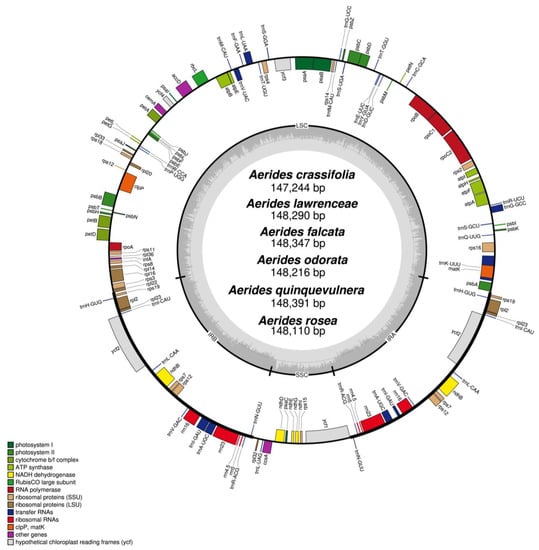 The annotation map of six Aerides plastomes. The darker gray in the inner circle corresponds to the GC content. The IRa and IRb (two inverted repeating regions), LSC (large single-copy region) and SSC (small single-copy region) are indicated outside of the GC content.