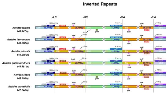 The plastome genomes across the six species of Aerides were aligned with mVISTA using the LAGAN alignment program [52] with the sequence of A. falcata as a reference. The rearrangements of plastomes were detected and plotted using Mauve of six species [53]. The boundaries between the IRs, SSC and LSC of the plastomes were compared using the online program IRscope (https://irscope.shinyapps.io/irapp/, accessed on 30 April 2023) [54].