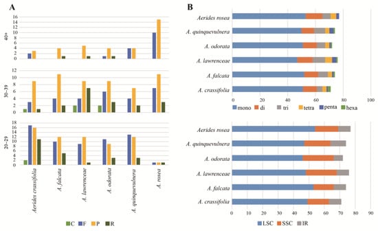 The number and distribution area of SSRs were analyzed to elucidate allied species or intra-species variations. The long repeats of Aerides plastomes, including the complement (C), forward (F), palindrome (P) and reverse (R) types, were analyzed by the online REPuter program [12] (Figure 3A, Supplementary Table S2). The number of large repeats detected in the six plastomes were 49 (A. falcata, A. odorata, A. quinquevulnera and A. rosea), 50 (A. lawrenceae) and 65 (A. crassifolia), respectively. Except for A. rosea, almost all the repeats ranged from 20 to 39 bp, with the fewest in 40–49 bp. No complement repeats were detected above 40 bp in length, and they were rare even in the smaller size ranges. In the 30–39 bp group, complement and reverse repeats were found in a few species (Figure 3A).
