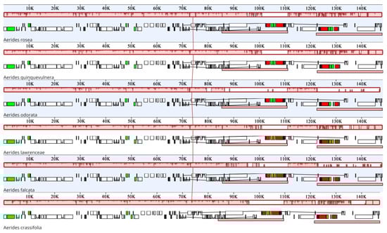 Plastome comparison of six species of Aerides using a progressive MAUVE algorithm.