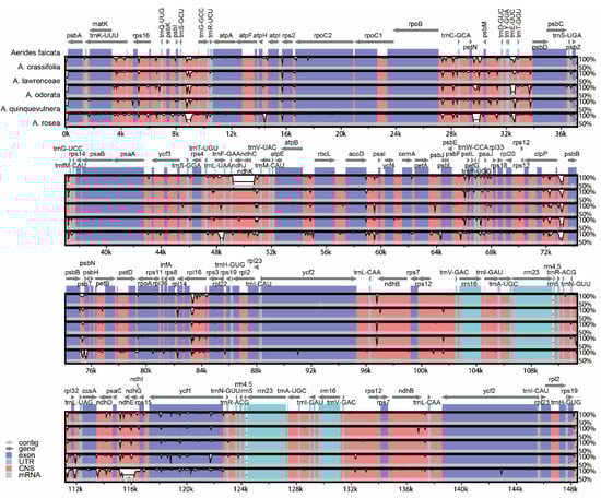 Global alignment of six Aerides plastomes using mVISTA with A. falcata as reference. The y-axis shows the coordinates between the plastomes.