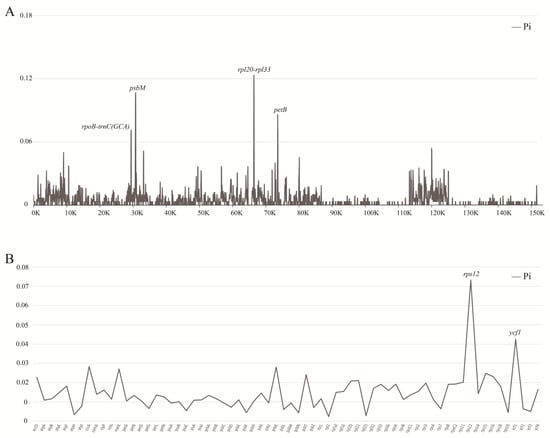 Sliding window test of nucleotide diversity (Pi) in the Aerides plastomes. (A) The nucleotide diversity of the complete plastome and four mutation hotspot regions (Pi > 0.06) were annotated. (B) The nucleotide diversity of 68 protein coding sequences showing two mutation hotspot regions (Pi > 0.03). The window size was set to 100 bp and the sliding window size was 25 bp. x -axis, position of the midpoint of a window; y -axis, Pi values of each window.