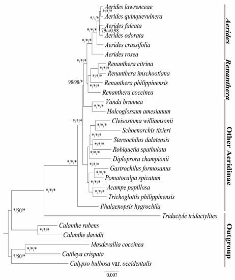 Phylogenetic tree of Aerides and the other 16 Aeridinae species based on the complete plastome data. Numbers near the nodes are bootstrap percentages and Bayesian posterior probabilities (BSML left, BSMP middle and PP right). A dash (-) indicates that a node is inconsistent between the topology of the MP/ML trees and the Bayesian tree. An asterisk (*) indicates that the node is 100 bootstrap percentage or 1.00 posterior probability.