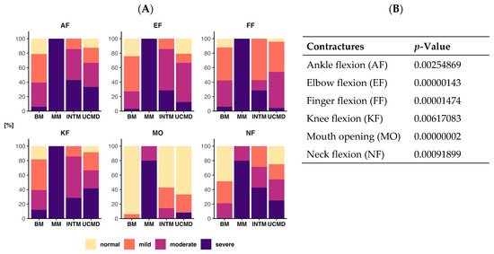 Bar chart showing frequencies for each grade of contracture (normal, mild, moderate, severe) and phenotype (BM, MM, INTM, UCMD) among the six joints tested (AF, EF, FF, KF, MO, NF) (A). The chi-square test of independence showed that the relationship between these variables was higly significant for all six different joint contractures examined (B).