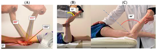 Bi-directional limitation in the range of motion in COL6-RM patients. The normal range of motion of elbow is 0–150° (full extension–full flexion). In this 55-year-old MM patient, the elbow could be moved in extension up to 69° and in flexion up to 111°, for a range of motion of only 42 degrees compared to the normal 150° (A). The normal range of knee flexion/extension is 150. In this 67-year-old BM patient, in the supine position, due to the contracture of the hamstrings, the knee could be extended 100° and remained flexed 50° (B). In the same patient in the prone position, due to the quadriceps contracture, the knee could only be flexed 66° (knee extension 84°) (C). The combined knee extension/flexion movement was 166° (100 + 66) compared to the normal 300° (B,C).