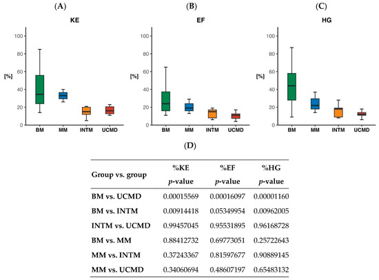 Box plots of percentage of predicted knee extension (A), elbow flexion (B), and hand grip (C) muscle strength in BM, MM, INTM, and UCMD patients. Significance of group versus group comparison (D).