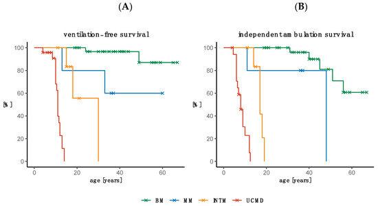 Thirteen patients were on NIV at the final visit, while 12 patients initiated NIV during the follow-up period (Table 1). The age at initiation of NIV was 24 and 49 years in two patients with BM, 13 and 33 years in two patients with MM, between 15 and 30 years in three patients with INTM, and between 4 and 14 years in 18 patients with UCMD. The age range in the four non-ventilated patients with INTM was 11–21 years and that in the five non-ventilated UCMD patients was 3–9 years. Kaplan–Meier curves depicting the ventilation-free status by age and COL6-RM phenotype demonstrated a statistically significant (p < 0.001) difference between the four COL6-RM groups (Figure 5A). The need for non-invasive ventilation occurred in 50% of patients with UCMDL by 11 years of age and by 30 years of age in INTM patients (Figure 5A).