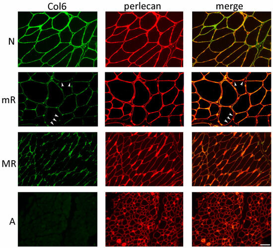 Immunofluorescence analysis of collagen VI (Col6, green) and the basement membrane component perlecan (red), and superimposed images (merge) on cross-sections of muscle biopsies of COL6-RM patients, showing the 4 main immunohistochemical patterns: N, normal expression and localization of collagen VI, as demonstrated by the overlap of collagen VI with the anti-perlecan staining in merge image; mR, partial deficiency in collagen VI in the basement membranes of muscle fibers (arrowheads), also evidenced by partial co-localization with anti-perlecan antibody; MR, diffuse loss of collagen VI labeling in the basement membrane of muscle fibers and accumulation of mutated protein in perivascular endomysial areas; A, absence of collagen VI. Scale bar, 100 µm.