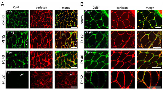 Immunofluorescence analysis of collagen VI (Col6, green) and the basement membrane component perlecan (red), and superimposed images (merge) on cross-sections of muscle biopsies of a healthy control and Col6-RM patients, performed at the indicated age. The first muscle biopsy in the three patients showed a mild reduction in collagen VI in Pt 12 (arrowheads), a marked reduction in Pt 40, and only a trace in patient Pt 52 (arrow). Scale bar, 50 μm (A). The repeated biopsies from the same Col6-RM patients show a striking increase in collagen VI amount around muscle fibers, with respect to the first biopsy. The change in the collagen VI pattern is particularly evident when comparing the first biopsy (shown in (A)) with the second biopsy (shown in (B)) in Pt 40 and Pt 52. Scale bar, 50 µm.
