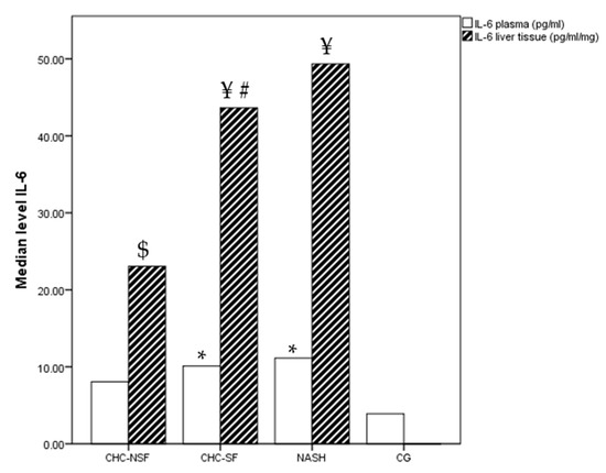 CHC-NSF: chronic hepatitis C with non-significant fibrosis, CHC-SF: chronic hepatitis C with significant fibrosis, NASH: non-alcoholic steatohepatitis, CG: control group, IL-6: interleukin 6. Median level of IL-6 in plasma and liver tissue of healthy controls and patients with liver diseases. Statistical difference was assessed using Kruskal–Wallis test. * p < 0.05 in comparison with CG; $ p < 0.05 in comparison with NASH; # p < 0.05 in comparison with CHC-NSF, ¥ p < 0.05 plasma levels in comparison with liver tissue levels (Post-hoc statistical difference using Mann–Whitney test); n (CG) = 20, n (NASH) = 19, n (CHC-NSF) = 20, n (CHC-SF) = 16.