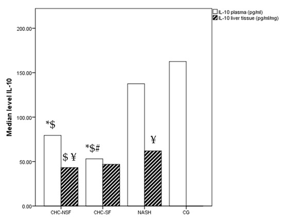 CHC-NSF: chronic hepatitis C with non-significant fibrosis, CHC-SF: chronic hepatitis C with significant fibrosis, NASH: non-alcoholic steatohepatitis, CG: control group, IL-10: interleukin 10. Median level of IL-10 in plasma and liver tissue of healthy controls and patients with liver diseases. Statistical difference was assessed using Kruskal–Wallis test. * p < 0.05 in comparison with CG; $ p < 0.05 in comparison with NASH; # p < 0.05 in comparison with CHC-NSF; ¥ p < 0.05 plasma levels in comparison with liver tissue levels (Post-hoc statistical difference using Mann–Whitney test); n (CG) = 20, n (NASH) = 19, n (CHC-NSF) = 20, n (CHC-SF) = 16.