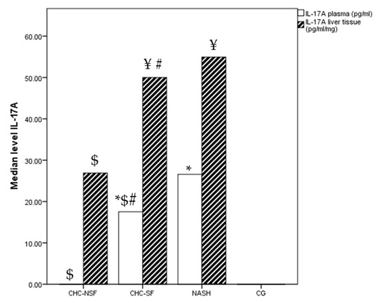 CHC-NSF: chronic hepatitis C with non-significant fibrosis, CHC-SF: chronic hepatitis C with significant fibrosis, NASH: non-alcoholic steatohepatitis, CG: control group, IL-17A: interleukin 17A. Median level of IL-17A in plasma and liver tissue of healthy controls and patients with liver diseases. Statistical difference was assessed using Kruskal–Wallis test. * p < 0.05 in comparison with CG; $ p < 0.05 in comparison with NASH; # p < 0.05 in comparison with CHC-NSF; ¥ p < 0.05 plasma levels in comparison with liver tissue levels (Post-hoc statistical difference using Mann–Whitney test); n (CG) = 20, n (NASH) = 19, n (CHC-NSF) = 20, n (CHC-SF) = 16.