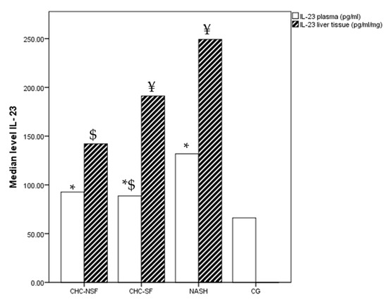 CHC-NSF: chronic hepatitis C with non-significant fibrosis, CHC-SF: chronic hepatitis C with significant fibrosis, NASH: non-alcoholic steatohepatitis, CG: control group, IL-23: interleukin 23. Median level of IL-23 in plasma and liver tissue of healthy controls and patients with liver diseases. Statistical difference was assessed using Kruskal–Wallis test. * p < 0.05 in comparison with CG; $ p < 0.05 in comparison with NASH; ¥ p < 0.05 plasma levels in comparison with liver tissue levels (Post-hoc statistical difference using Mann–Whitney test); n (CG) = 20, n (NASH) = 19, n (CHC-NSF) = 20, n (CHC-SF) = 16.