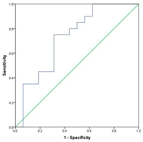 ROC curve of plasma IL-10 as biomarker for distinguishing CHC-NSF and CHC-SF patients. CHC-NSF: chronic hepatitis C with non-significant fibrosis, CHC-SF: chronic hepatitis C with significant fibrosis, IL: interleukin, blue line: ROC curve; green line: baseline.