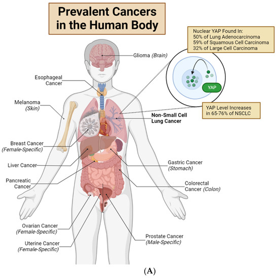 In tumors, YAP plays important roles in regulating neoplasm initiation, growth, metastasis, and drug resistance. Importantly, overexpression and nuclear translocation of YAP occur in multiple tumor types [19] (Figure 2A). For example, in lung adenocarcinomas, 76% of the cases show overexpression of YAP and TAZ [19]. However, increasing evidence suggests that the genetic dysregulation of components within the Hippo pathway is rare (reviewed in ref. [12,20]). These data indicate that the abnormal YAP activities discovered in tumors are likely regulated by Hippo-independent mechanisms. Moreover, a dysregulated Hippo pathway may only induce dysregulated pYAP-S127. The combination of the Hippo pathway, Src-FAK pathway, and mechanical stimulus regulates the nuclear translocation of YAP. The overall nuclear translocation of YAP determines the change in the downstream gene expression and cellular function (Figure 2B,C).
