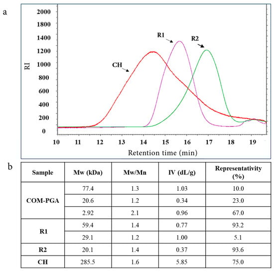 (a) Overlay chromatograms of SEC-TDA analyses of chitosan (CH), R1, and R2 ultrafiltrated fractions of poly-γ-glutamic acid (COM-PGA). (b) Average molecular weight (Mw), dispersity (Mw/Mn), intrinsic viscosity (IV), and representativity of the main peaks.