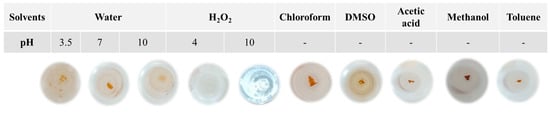 Images of CHR1(2/8) sample immersed in distilled water at different pH values (3.5, 7.0, and 10.0), or in 30% (w/v) of H2O2 at different pH 4.0 and 10.0, or in different organic solvents.