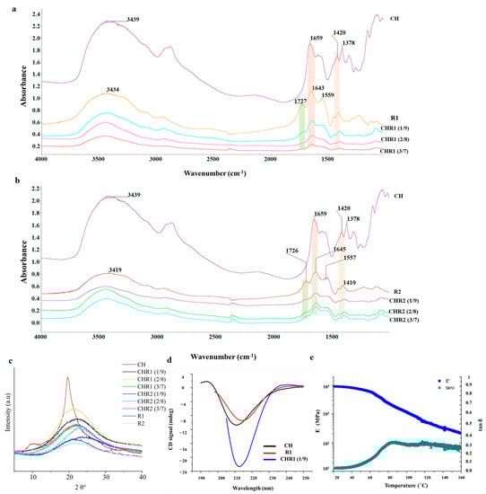 (a) Fourier transform infrared spectroscopy (FTIR) spectra of CHR1. (b) FTIR spectra of CHR2 blends. (c) X-ray diffractograms of CHR1 and CHR2 using three different ratios CH/R1 or CH/R2 (1/9, 2/8 and 3/7) in comparison with the single biopolymers of chitosan (CH) and poly-γ-glutamic acid (γ-PGA) fractions (R1 and R2). (d) Circular dichroism spectra of CHR1 (1/9 ratio) in comparison with CH and γ-PGA R1 fraction. (e) Storage modulus (E′) and tan δ values by DMA analysis of the crosslinked materials of CHR1 (3/7).