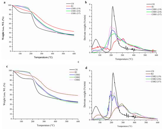 Thermogravimetric (TG) (a,c) and differential thermogravimetric (DTG) (b,d) analyses of CHR1 and CHR2 blends, obtained with three different CH/R1 or CH/R2 ratios (1/9, 2/8 and 3/7). The curves were compared to the single biopolymers of chitosan (CH) and poly-γ-glutamic acid fractions (R1 and R2).