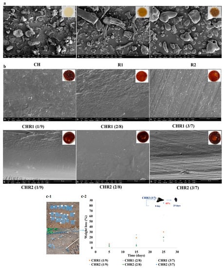 Scanning electron microscope (SEM) analyses of CH, R1, and R2 powders revealed a heterogeneous morphology for biopolymers with irregular particles (100–200 mm) (Figure 5a). As far as R1, elongated/fibrillar structures (200–300 mm) were also present. In addition, SEM images showed a flat and homogeneous structure for all of the glass-like materials prepared at all CH/R1 and CH/R2 ratios (Figure 5b). The observed structure demonstrated that complexation between the oppositely charged biopolymers produced a smoothed surface as well as the absence of voids and/or other morphological defects. Moreover, SEM images confirmed the absence of phase separation between CH and R1 or R2 in all of the blend ratios. Finally, Figure 5c-1,c-2 shows some preliminary results on the disintegration of the glass-like materials. The results show marked changes in the weight over time when samples were buried in the soil [39]. It is well known that as water diffuses from the soil into the polymer samples, their swelling and degradation increases because of the role played by water as a carrier of soil microorganisms able to depolymerize and transform the biopolymers in biomass, CO2, and water [40]. All of the sample weights gradually decreased during the experiment. The samples showed low disintegration after 5 days with a loss of weight of 3.0–8.0%, while the degradability increased after 15 days as the mass reached 25.0%. Finally, the degradability further increased in the next 25 days, and the weight loss of the samples was between 13.0 and 85.0% and, in particular, was 62.0% for CHR1 (3/7 ratio) and even higher (85.0%) for CHR2 (3/7 ratio). These results suggest that these materials are degradable in soil under open-air environmental conditions.