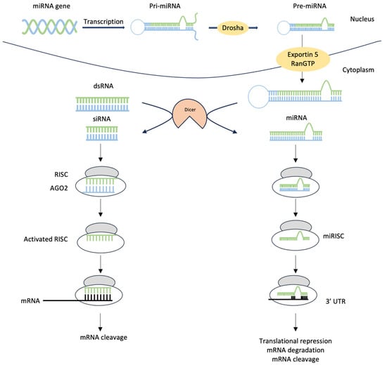 Common mechanisms of gene silencing driven by siRNA and miRNA. siRNA: dsRNA, produced from an miRNA gene is transcribed into a primary miRNA (pri-miRNA) and then processed by Drosha into precursor miRNAs (pre-miRNAs) in the nucleus. Pre-miRNAs are exported out of the nucleus into the cytoplasm, where it is processed by Dicer into siRNA, which is loaded into the RNA-induced silencing complex (RISC). Argonaute (AGO2), which is a component of RISC, cleaves the passenger strand of siRNA that is then degraded by cellular machinery. The guide strand then guides the active RISC to the target mRNA. The complementary binding between the guide strand of siRNA and the target mRNA leads to the cleavage of mRNA. miRNA: Transcription of an miRNA gene is performed by RNA polymerase II in the nucleus to generate pri-miRNA, which is then cleaved by Drosha to form pre-miRNA. The pre-miRNA is transported by exportin 5 to the cytoplasm, where it is processed by Dicer into miRNA. Similar to siRNA, the miRNA is loaded into the RISC, where the passenger strand is degraded. The miRISC is guided by the remaining guide strand to the target mRNA through partial complementary binding. Unlike siRNAs, miRNAs are known to post-transcriptionally regulate target mRNAs through the 3′-UTR, which interacts mainly with the 5′-end of the target mRNA. Image adapted from [78].