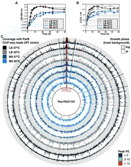 ParB binding to the P. aeruginosa chromosome is dependent on the growth conditions. Growth of Pae PAO1161 (WT) strain in LB or M9 medium +0.5% glucose at 30 °C or 37 °C presented as (A) mean optical density at 600 nm ± SD from three cultures and (B) mean number of colony-forming units (CFUs) per mL ± SD assayed for three cultures. (C) ChIP-seq analysis of ParB binding to genome assayed using WT strain cells from cultures in LB or M9 medium, grown at 30 or 37 °C, at two time points representing exponential and stationary phases of culture growth (indicated on (A) with red lines). Track data represent normalized coverage of the genome with ChIP-seq reads (binned at 200 bp and averaged from two ChIP-seq replicates). Color of coverage track represents different growth conditions, whereas track background indicates the phase of culture growth. Track height was set at 10% of max. coverage signal of the outer track. Short bars below each track represent the distribution of detected ChIP-seq peaks for these samples, colored according to the peak fold enrichment (FE).