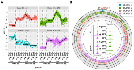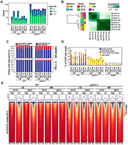 The coverage of the genome with ChIP-seq reads and consequently the number of ParB peaks varied most significantly between the samples from the exponentially growing versus stationary cultures on the rich medium, with the coverage with reads and peak fold enrichment (FE) for the majority of peaks elevated in samples derived from stationary cultures (WT log 30 °C and WT log 37 °C, Figure 1C). No major differences in the number of peaks and their FE were observed between the cultures grown on the minimal medium (four inner tracks, Figure 1C). Similar analysis of data obtained for parS1–4 strain showed that, in contrast to the WT strain, an increase in the number of ParB-enriched regions was observed for samples derived from the logarithmic phase of the growth at 37 °C on LB in comparison to the stationary phase of the same culture (Figure S2). Otherwise, the distribution of ParB peaks and their FE were not significantly affected by the tested growth conditions in this strain (discussed below).