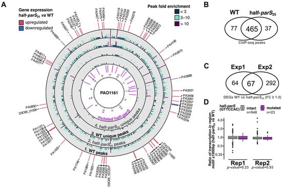 ParB binding to half-parS plays an indirect role in gene expression regulation in P. aeruginosa. (A) Circular plot indicating genomic localization of peaks identified in WT and half-parS25 strains (tracks 1 and 2) and peaks identified only in one of the strains (track 3 and 4). The positions of half-parS motifs modified in half-parS25 strain are colored with violet. The outer ring indicates 67 genes identified as differentially expressed in both RNA-seq experiments, colored according to the expression change trend. Labels indicate PAO1 gene IDs, or PAO1161 IDs (D3C65_), for genes annotated only in the PAO1161 genome. (B) Comparison of ChIP-seq peaks identified in WT and half-parS25 strains. (C) Comparison of sets of differentially expressed genes identified in two independent RNA-seq analyses. (D) Effect of the half-parS mutations on the transcription of surrounding genome fragments. Reads mapping to genome fragments ± 1000 bp from GTTCCAC motifs were counted in RNA-seq sample, and normalized for the total read count, and the ratio between WT and half-parS25 samples was calculated. Dots indicate outliers. Statistical significance between the two groups was evaluated using the Wilcoxon rank sum test.