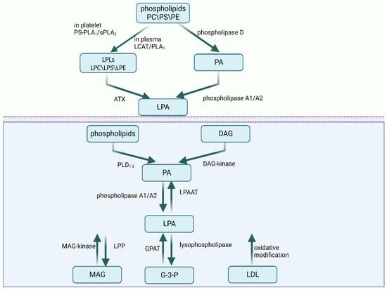 The extracellular and intracellular metabolism of LPA. Abbreviations: PC—phosphatidylcholine; PS—phosphatidylserine; PE—phosphatidylethanolamine; PS-PLA1—phosphatidylserine-specific phospholipase A1; sPLA2—secretory phospholipase A2; LCAT—lecithin–cholesterolacyltransferase; LPLs—lysophospholipids; LPC—lysophosphatidylcholine; LPS—lysophosphatidylserine; LPE—lysophosphatidylethanolamine; ATX—autotaxin; DAG—diacylglycerol; PLD—phospholipase D; LPAAT—LPA-acyltransferase; MAG—monoacylglycerol; GPAT—glycerophosphate acyltransferase; G-3-P—glycerol 3-phosphate; LDL—low-density lipoprotein. Created with BioRender.com (accessed on 28 July 2023).