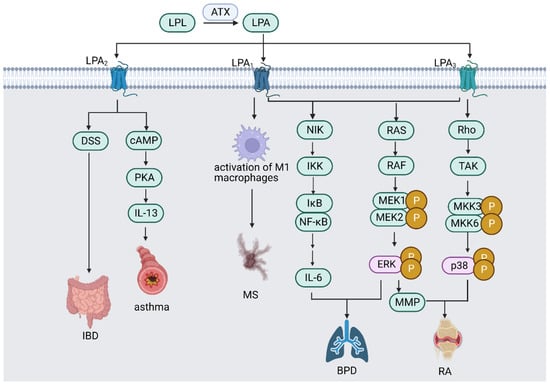 ATX/LPA signaling pathway in different inflammatory diseases. ATX/LPA signaling pathway mediates various inflammatory diseases through LPA receptors. LPA1 promotes MS by activating M1 macrophages; LPA2 worsens DSS-induced IBD; LPA2 causes asthma by enhancing IL-13 expression via activating PKA signaling pathway; LPA1 and LPA3 promote BPD by producing IL-6 via activating NF-κB signaling pathway; LPA1 and LPA3 activate ERK signaling pathway, which promotes BPD and worsens RA via producing MMP; and LPA3 mediates the pathogenesis of RA by activating p38 MAPK signaling pathway. (Abbreviations: LPL—lysophospholipid; ATX—autotaxin; LPA—lysophosphatidic acid; MS—multiple sclerosis; DSS—dextran sulfate sodium; IBD—inflammatory bowel disease; cAMP—cyclic adenosine 3,5-monophosphate; PKA—protein kinase A; IL—interleukin; NIK—NF-κB-inducing kinase; IKK—IκB kinase; NF-κB—nuclear factor κB; ERK—extracellular-signal-regulated kinase; MMP—matrix metalloproteinase; TAK—transforming growth-factor-β-activated kinase; MKK—mitogen-activated protein kinase kinase; BPD—bronchopulmonary dysplasia; RA—rheumatoid arthritis). Created with Biorender.com (accessed on 28 July 2023).