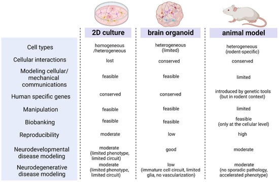 Comparison of characteristics among two-dimensional (2D) cell culture, three-dimensional (3D) brain organoid models, and animal models. Organoids have advantages compared to 2D cultures and animal models, and can be a practical platform for modeling diseases with conserved human-specific genes and cellular interactions that enable biobanking and cellular manipulations.