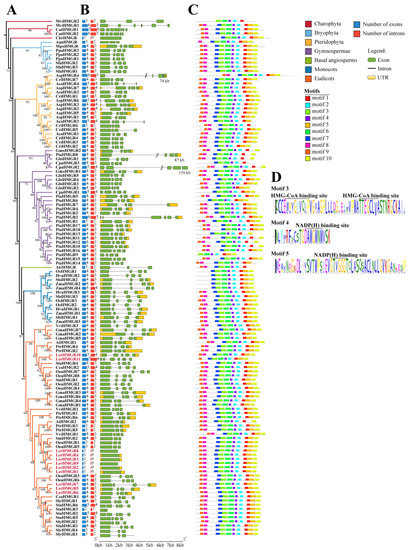 Identification, phylogeny, gene structure, and conserved motif analysis of 124 HMGR family genes from 29 representative plants. (A) The identification and phylogenetic tree of 124 HMGRs. The phylogenetic tree was constructed based on full-length protein sequences using the maximum likelihood method with 1000 replicates. Mvi: Mesostigma viride, Cat: Chlorokybus atmophyticus, Cbr: Chara braunii, Aan: Anthoceros angustus, Mpo: Marchantia polymorpha, Ppa: physcomitrella patens, Sfa: Sphagnum fallax, Asp: Alsophila spinulosa, Cri: Ceratopteris richardii, Aca: Adiantum capillus, Gmo: Gnetum montanum, Pta: Pinus tabuliformis, Gbi: Ginkgo biloba, Cpa: Cycas panzhihuaensis, Atr: Amborella trichopoda, Osa: Oryza sativa, Hvu: Hordeum vulgare, Sbi: Sorghum bicolor, Zma: Zea mays, Vvi: Vitis vinifera, Gma: Glycine max, Ath: Arabidopsis thaliana, Ptr: Populus trichocarpa, Ler: Lithospermum erythrorhizon, Stu: Solanum tuberosum, Cca: Coffea canephora, Oeu: Olea europaea, Sin: Sesamum indicum, Sly: Solanum lycopersicum. Pink solid circle represents LerHMGRs. (B) The number of exons and introns and the gene structure of 124 HMGRs. (C) The distribution of the conserved motif. The ten conserved motifs were identified using the MEME program. (D) Three conserved motif logos including HMG-CoA binding sites and NADP(H) binding sites.
