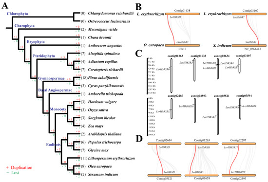 Gene expansion, synteny analysis and genome location of HMGRs in L. erythrorhizon. (A) Gene duplication and loss analysis of HMGR family genes using Notung software in 19 representative plants. Gene duplications and losses are represented by the + and − numbers on each branch. The numbers in parentheses in (A) represent the number of HMGR gene family members identified from different species. (B) Synteny blocks of HMGRs between L. erythrorhizon and O. europaea, S. indicum. (C) Location of LerHMGRs in the genome of L. erythrorhizon. (D) Synteny blocks of six LerHMGRs. The red line represents the homologous HMGRs between L. erythrorhizon and O. europaea, S. indicum, and L. erythrorhizon.
