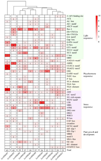 Types and numbers of cis-acting element in the promoters of LerHMGRs. Different colors and numbers of the grids indicate the numbers of different types of cis-acting element types in the promoters.