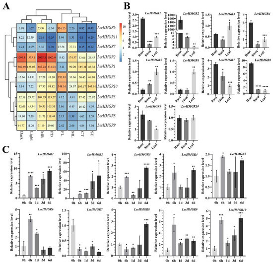 Expression pattern of LerHMGRs in different tissues and cultured L. erythrorhizon callus cells/hairy roots. (A) Heat map showing the expression profile of LerHMGRs in different tissues of L. erythrorhizon using transcriptome data. Dark: M9 and darkness-cultured hairy roots; Light: B5 and light-cultured hairy roots; MR: mature root; PD: periderm of mature root; FL: flowers; ML: leaves + stems; CT: cortex of mature root; SE: stele of mature root. The number in the grid is the TPM value of each gene in different tissues and under different treatments. The expression values were normalized by Log2 (TPM + 1) to create the heat map, using the average TPM of three biological replicates. (B) The expression level of LerHMGRs in the leaf, stem, and root of L. erythrorhizon was analyzed using qPCR. (C) The expression level of LerHMGRs in L. erythrorhizon cells cultured in M9 and darkness for different times (0 h, 6 h, 1 day, 3 day, and 6 day) was detected using qPCR. The error bars indicate the SDs of three replicates. Asterisks represent significant differences via the Student’s t-test analysis (* p < 0.05, ** p < 0.01, *** p < 0.001, **** p < 0.0001) as compared with root in (B) and 0 h in (C), respectively.