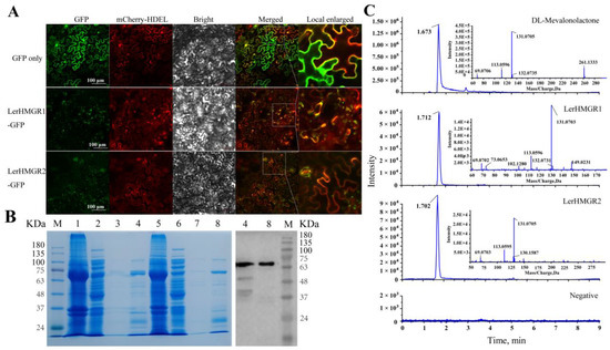 Proteins can perform their biological functions only if they have the correct subcellular localization. To confirm whether LerHMGR1 and LerHMGR2 actually have enzymatic activities to catalyze the conversion of HMG-CoA and NADPH into mevalonate, we first transiently expressed LerHMGR1-eGFP and LerHMGR2-eGFP in tobacco leaf cells to determine the subcellular localization. The green fluorescence of the HMGR-eGFP fusion protein was only detected in the endoplasmic reticulum (ER) labeled with the marker protein mCherry-HDEL, whereas the eGFP protein had no specific localization distribution in tobacco cells, which is consistent with the results demonstrating the insertion of Arabidopsis HMGR localization into the ER [51]. This suggests that LerHMGR1 and LerHMGR2 are predominantly localized at the ER in plant cell (Figure 5A, Table S2).